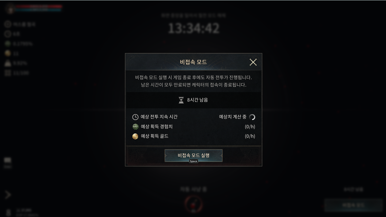 간단하게 남은 시간동안에 얼마만큼의 경험치와 골드를 먹을지 예상해서 알려주는데 "비접속 모드 실행"을 눌러주면 바로 실행됩니다.