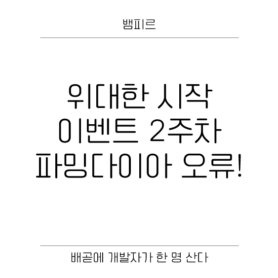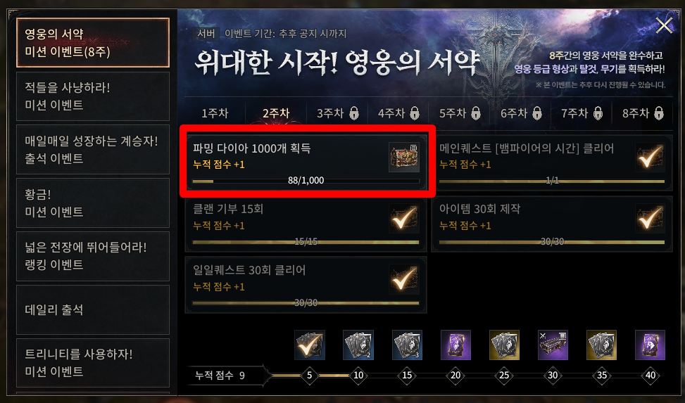 오픈 2주차를 지나 달려가고 있는 뱀피르에 오류가 하나 났어요. 바로 "위대한 시작! 영웅의 서약" 이벤트의 2주차, "파밍 다이아 1000개 획득" 이 정상적으로 완료되지 않는 문제가 있습니다.