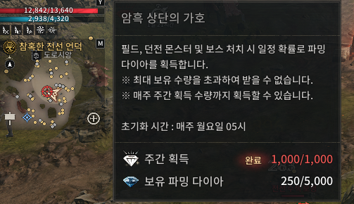 파밍다이아는 모두 알다시피 필드 또는 던전에서 몹을 사냥하면 주는 다이아로, 주간 1000개의 제한이 있지요.